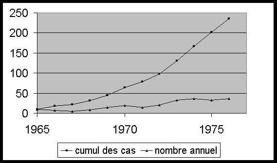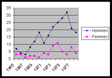 Néanmoins, l'utilisation de la méthode d'enregistrement employée révèle une augmentation linéaire avec le temps de l'incidence annuelle du mésothéliome depuis 1965. L'approximation de cette évolution par des fonctions analytiques permet de prévoir, si la tendance actuelle était maintenue, la survenue de 108 cas nouveaux reportés dans le Registre en l'an 2000 ; cependant, pour les raisons invoquées ci-dessus, cette vision n'a pas de valeur à l'échelle nationale. Par ailleurs l'étude de l'évolution temporelle des mésothéliomes a montré l'augmentation de l'écart entre le nombre de cas masculins et féminins (fig. 4), traduisant l'intervention de facteurs professionnels dans l'étiologie du mésothéliome.