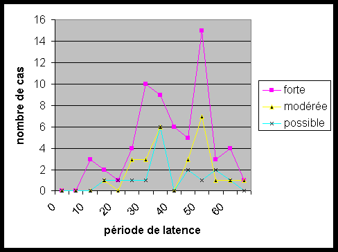 La figure 7 montre la distribution des cas dans les différents groupes d'exposition professionnelle en fonction de la période de latence. Cette distribution est apparue bimodale quelque soit le groupe d'exposition.