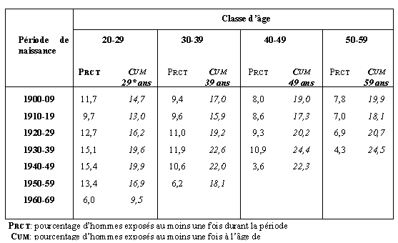 La proportion dhommes exposés à lamiante dans chaque génération par classe dâge de 10 ans est présentée dans le Tableau 1. La classe la plus exposée est celle des 20-29 ans, et la période où la proportion de la population masculine exposée est la plus élevée, dépassant 15%, est celle des années 1960-1970, qui correspond à la fois à une période dexpansion de léconomie française et de lutilisation de lamiante. Le Tableau 1 présente également la proportion cumulative dexposés jusquà différents âges : la génération née entre 1930 et 1939 a été dans lensemble la plus exposée, et la proportion dhommes exposés au moins une fois dans leur vie professionnelle est de 24,5 % dans cette génération. Ce sont les générations qui ont commencé leur vie professionnelle autour de 1950 qui présentent la proportion cumulative dexposés jusquà lâge de 40 ans la plus élevée.