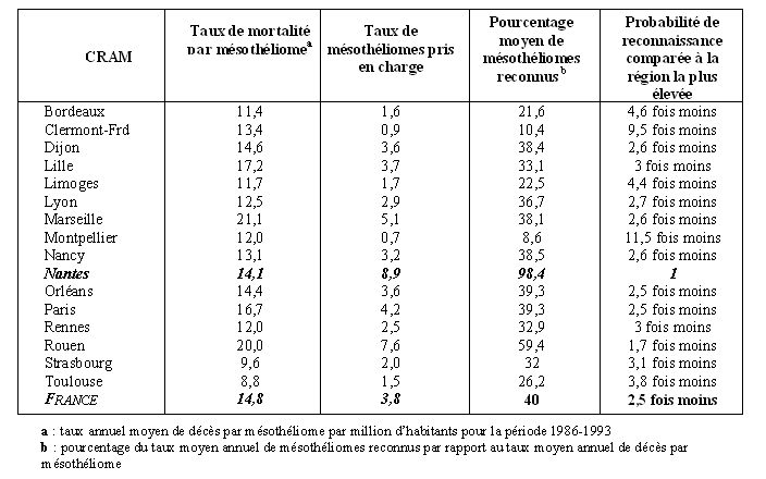 Le pourcentage des mésothéliomes pris en charge comme maladie professionnelle par rapport aux décès par mésothéliome est de 40 % en moyenne, avec de très fortes disparités régionales, la CRAM de Nantes présentant le taux de reconnaissance le plus élevé, et celle de Montpellier le plus basse : la probabilité quun mésothéliome soit pris en charge comme maladie professionnelle y est 11,5 fois plus faible. En dehors de ces cas extrêmes, la plupart des régions ont un comportement voisin, cest-à-dire proche du déficit national.